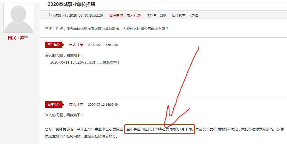 受疫情影響,今年事業單位考試已往后推遲,近日,有網友在宣城市人社局上提問:今年事業單位什么時候筆試?11日人社局也是給出了回復:全市事業單位公開招聘筆試時間為:7月下旬!小編帶大家一起去看看吧: