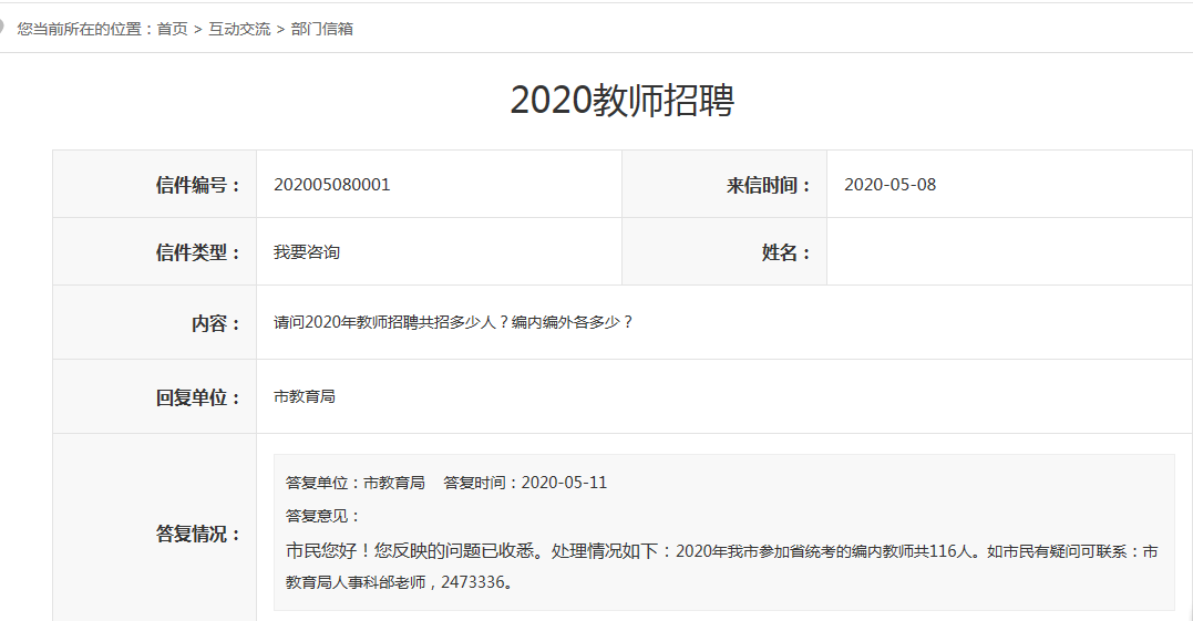 | 市民您好!您反映的問題已收悉。處理情況如下:2020年我市參加省統考的編內教師共116人。如市民有疑問可聯系:市教育局人事科邰老師,2473336。 | |||