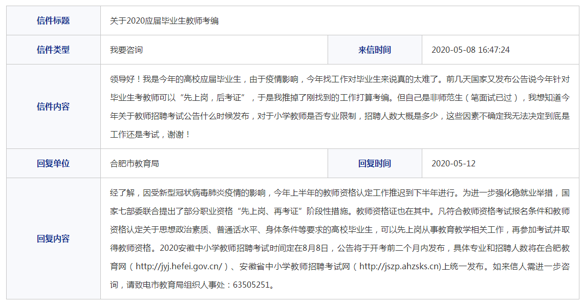 信件內容:領導好!我是今年的高校應屆畢業生,由于疫情影響,今年找工作對畢業生來說真的太難了。前幾天國家又發布公告說今年針對畢業生考教師可以“先上崗,后考證”,于是我推掉了剛找到的工作打算考編。但自己是非師范生(筆面試已過),我想知道今年關于教師招聘考試公告什么時候發布,對于小學教師是否專業限制,招聘人數大概是多少,這些因素不確定我無法決定到底是工作還是考試,謝謝!