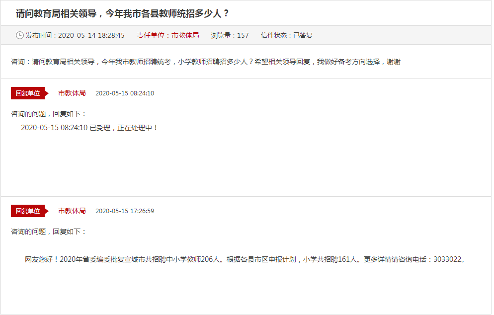 在5月14日,有網友在宣城市教育體育局互動交流平臺提問:請問教育局相關領導,今年我市教師招聘統考,小學教師招聘招多少人?宣城市教體局也是給出了如下回復:2020年省委編委批復宣城市共招聘中小學教師206人。根據各縣市區申報計劃,小學共招聘161人。
