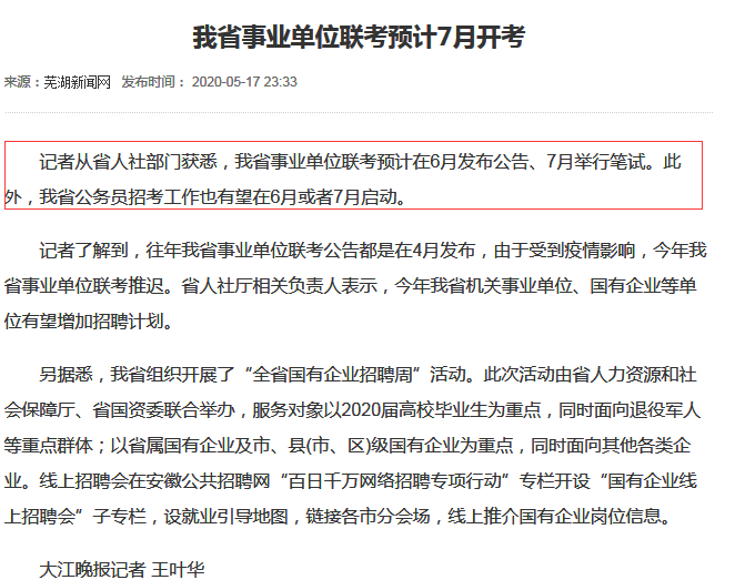 除了2020年安徽省考外,2020年安徽事業單位統考也將于6月發布公告,7月筆試。