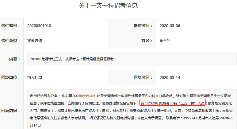 另外,2020年蕪湖市三支一扶計劃招50人(以下內容及截圖來源于蕪湖市人民政府):
