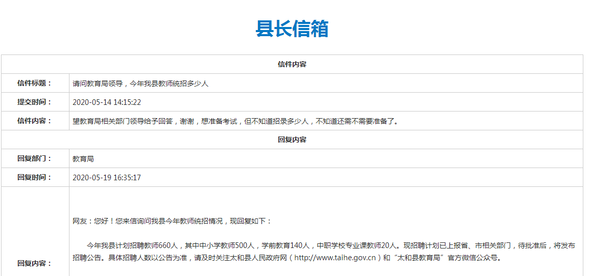網友:您好!您來信詢問我縣今年教師統招情況,現回復如下: