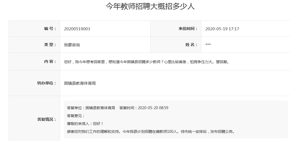 答復單位:固鎮縣教育體育局 答復時間:2020-05-20 08:59