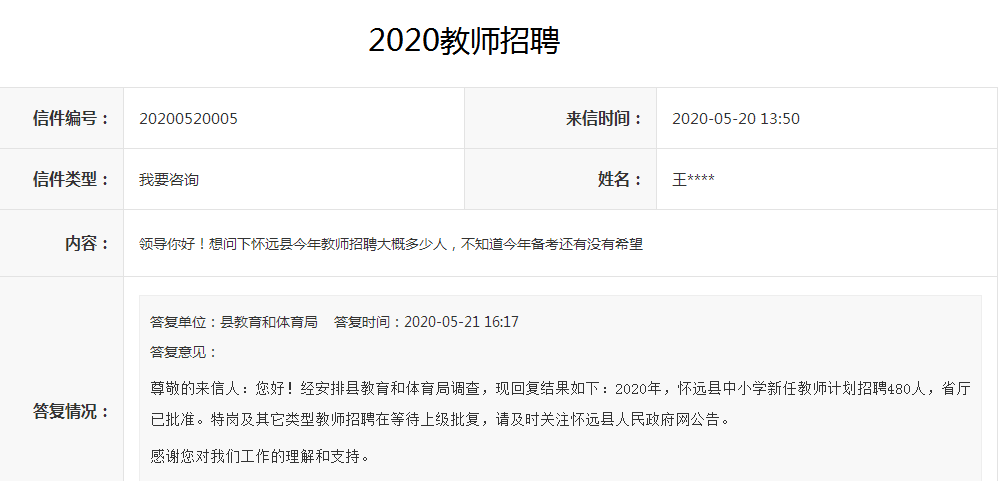 尊敬的來信人:您好!經安排縣教育和體育局調查,現回復結果如下:2020年,懷遠縣中小學新任教師計劃招聘480人,省廳已批準。特崗及其它類型教師招聘在等待上級批復,請及時關注懷遠縣人民政府網公告。