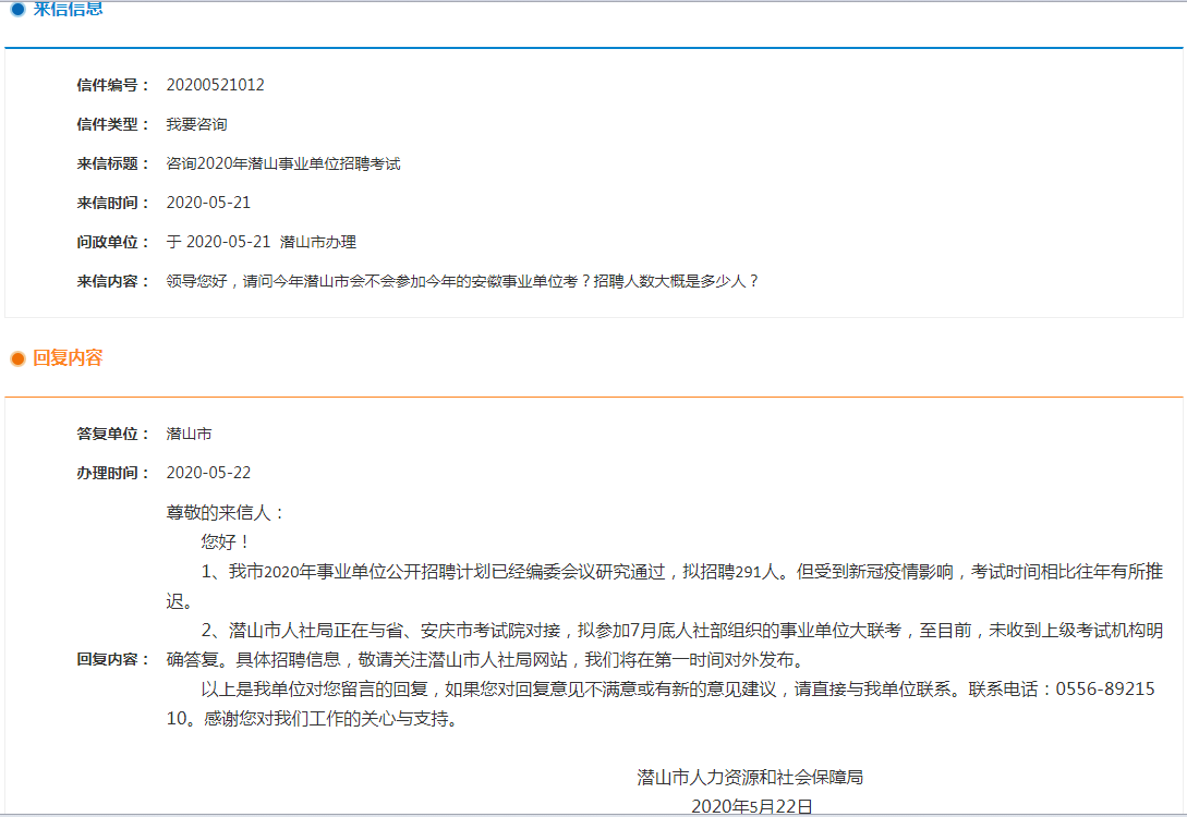 來信內容:領導您好,請問今年潛山市會不會參加今年的安徽事業單位考?招聘人數大概是多少人?