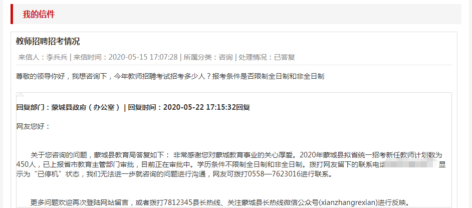 更多問題歡迎再次登陸網(wǎng)站留言,或者撥打7812345縣長熱線、關(guān)注蒙城縣長熱線微信公眾號(xianzhangrexian)進(jìn)行反映。