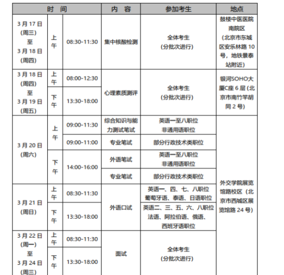 近年來,外交部的面試形式均為結構化面試,面試時間為20-30分鐘,題量4-11題,考官讀題。除了面試之外,還需進行相應的專業能力測試和心理素質測試,其中專業能力測試包括綜合知識與能力測試(筆試)、專業筆試、外語筆試、外語口試;心理素質測試分批次進行,不計入綜合成績。