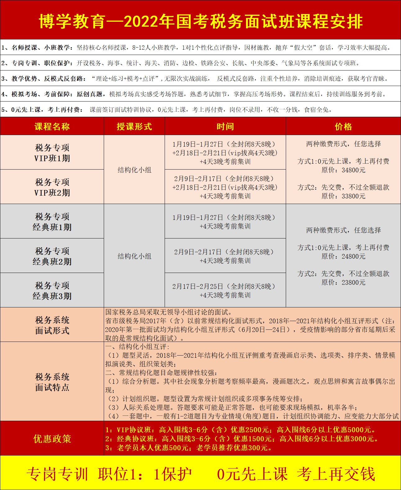 稅務局面試形式和特點 面試形式:國家稅務總局采取無領導小組討論的面試。 省市級稅務局2017年(含)以前常規(guī)結構化面試形式,2018年—2021年結構化小組互評形式(注:2020年第一批面試均為結構化小組互評形式(6月20日—24日),受疫情影響的部分省市延期后采取的是常規(guī)結構化面試)。 面試題量:結構化小組互評每套題3道題目;常規(guī)結構化面試每套題4道題目。 面試時間: (1)結構化小組互評:15分鐘場外備考看題,進入考場后,按要求每人依次答題,每道題目3分鐘(注:個人答題時間:2020年—2021年均為3分鐘,2018年—2019年均為2分鐘);全部答題結束,按要求展開互評,點評每人的時間為2分鐘;被點評人針對點評展開回應,時間2分鐘。 (2)常規(guī)結構化面試:4道題目20分鐘,剩余3分鐘提醒時間。 (3)無領導討論:20分鐘場外備考看材料,然后進入考場總時間85分鐘,首先個人陳述每人3分鐘,然后根據(jù)問題展開自由討論,最后推選一個代表作5分鐘陳述總結。 考查方式:看題+聽題相結合的 面試試題特點 第一、結構化小組互評: (1)題型靈活,2018年—2021年結構化小組互評側重考查漫畫啟示類、選項類、排序類、情景模擬演說類、組織策劃類; 第二、常規(guī)結構化題目命題規(guī)律性較強: (1)綜合分析題。其中社會現(xiàn)象分析題考察頻率最高,漫畫題次之,觀點思辨和寓言故事偶爾出現(xiàn); (2)計劃組織題。題型設置為常規(guī)計劃組織或多項事務統(tǒng)籌安排; (3)人際關系處理題。答題要求可能是正常答題,也可能要求現(xiàn)場模擬,機率各半; (4)一套題中,一般有1-2道題目為專業(yè)情境(角度)題目,計劃組織協(xié)調能力、應變能力大部分試題為國稅專業(yè)情境題,綜合分析有少量的國稅專業(yè)角度題目,總體難度不大。