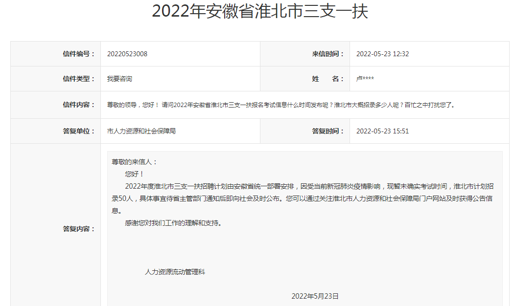 領導,您好!請問2022年安徽省淮北市三支一扶報名考試信息什么時間發布呢?淮北市大概招錄多少人呢?百忙之中打擾您了。