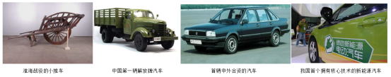 淮海戰役的小推車;中國第一輛解放牌汽車; 首輛中外合資的汽車; 我國首個擁有核心技術的新能源汽車。看到這四幅圖片你想到了什么?