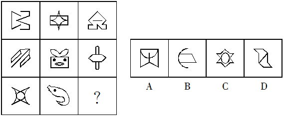 1.【答案】A。解析:每行或每列三個圖形的對稱軸各有0、1、2條,應選擇有1條對稱軸的圖形,A符合。