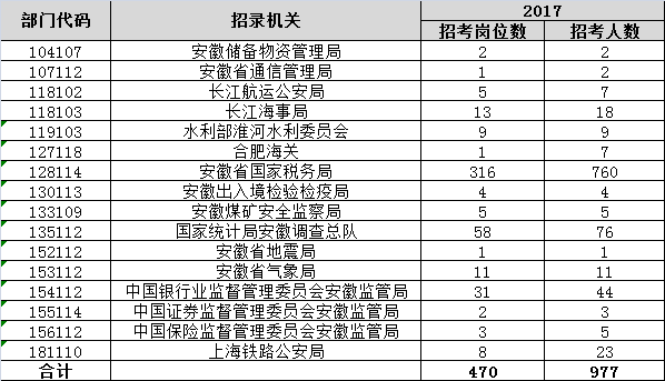 2018國家公務員考試職位表(安徽地區)共招聘470崗位,977人。