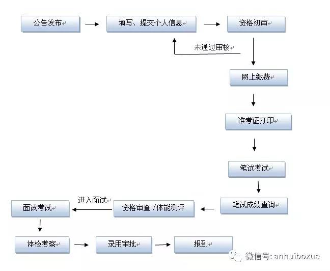 下面給還不了解安徽省考的考生簡單介紹一下,安徽省考按照以下流程進行:公告發布——職位查詢——網上報名——報名確認——準考證打印——筆試——面試——體檢考察——錄用。